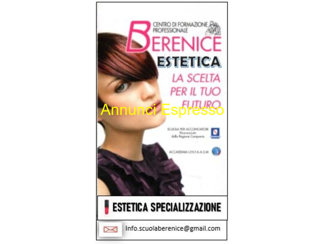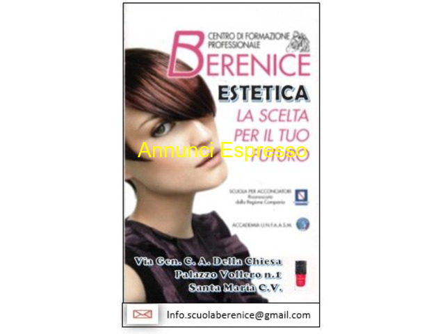 corso CORSI DI ESTETICA La Scuola Berenice offre corsi di ESTETICA per ESTETISTA BIENNALE, SPECIALIZZAZIONE, 300H (se hai tre anni di lavoro full time negli ultimi cinque) e 550H (se già hai lavorato nel settore ed hai qualifiche parziali di truccatore, estetista-visagista, depilatore, manicurista, massaggiatore facciale, pedicurista estetico e vuoi completare la tua formazione). AULA+LABORATORIO&STAGE con possibilità di qualifica professionale con valenza europea. KIT DIDATTICO e PLACEMENT inclusi. Piani di pagamento personalizzati con possiblità di pagamenti rateali. Contattateci per qualsiasi informazione su info. scuolaberenice[at]gmail. com. . . Santa Maria Capua Vetere (CE)