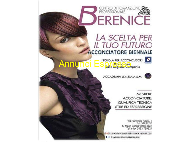 corso CORSI DI FORMAZIONE PER ACCONCIATORE La scuola Berenice di Santa Maria Capua Vetere offre corsi di ACCONCIATORE per: Acconciatore Biennale, Specializzazione ed Acconciatore 350H (se hai maturato tre anni di contributi full time negli ultimi cinque). I corsi sono in offerta con piani di pagamento personalizzati e rateizzabili. AULA+LABORATORIO&STAGE e KIT INCLUSO!!! Qualifica professionale valida in tutta Europa con servizio PLACEMENT. Richiedi informazioni per un ricevere un VOUCHER sconto, scrivendoci su ad info. scuolaberenice[at]gmail. com Santa Maria Capua Vetere (CE)