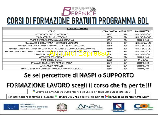 corso CORSI GRATUITI PROGETTO GOL ACCONCIATURA/ESTETICA/AMMINISTRAZIONE FINALMENTE A CATALOGO TUTTI I CORSI GRATUITI COL PROGETTO GOL PER I DESTINATARI WORKING POOR/NASPI/SUPPORTO FORMAZIONE LAVORO. 128188;TEORIA+STAGE=MAGGIORI COMPETENZE PER IL MONDO DEL LAVORO. Tutte le news sul nostro sito sezione CATALOGO DINAMICO GOL https://bereniceaccademy. wixsite. com/. . . /catalogo-dinamico. Se vuoi sapere se ne hai diritto scrivici Siamo sempre a disposizione dei nostri allievi 128187;Ti aiuteremo a compilare la domanda per partecipare ai nostri prossimi corsi in uscita. . . Santa Maria Capua Vetere (CE)
