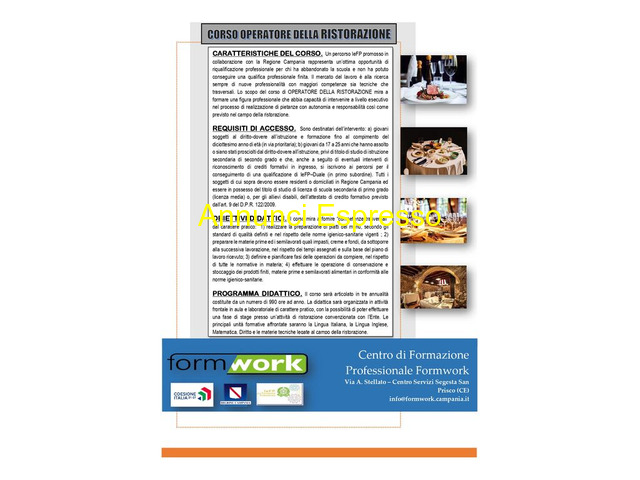 corso CORSO GRATUITO IEFP OPERATORE DELLA RISTORAZIONE L'Ente Formwork promuove un corso gratuito di OPERATORE DELLA RISTORAZIONE suddiviso in tre annualità con possibilità di aula, stage e laboratorio di cucina. Il corso da la possibilità di poter conseguire una qualifica professionale regionale. Il corso sarà un percorso importante che ti consentirà di intraprendere da vicino i segreti della professione. Oltre ad una fase d'aula, si seguirà una fase di stage ed in un secondo stadio uno stage presso un'azienda di ristorazione convenzionata. Se interessati, contattateci pure via mail. San Prisco (CE)