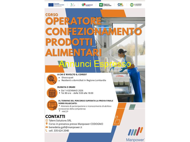 corso CORSO GRATUITO OADDETTO AL CONFEZIONAMENTO ALIMENTARE - CODOGNO Aperte le iscrizioni al corso gratuito "OPERATORE AL CONFEZIONAMENTO DEI PRODOTTI ALIMENTARI" con attestazione di partecipazione e il riconoscimento di abilita' e conoscenze della competenza della durata di 80 ore, dal 14 GENNAIO 2026, da lunedi' a venerdi'. Le lezioni verranno svolte in presenza con orario 09-18. 00. Sede di svolgimento: Manpower CODOGNO. Argomenti principali: - le aziende del settore alimentare - il confezionamento: materiali e processi - merceologia di settore - standard di qualità dei prodotti - sistema di autocontrollo igienico (Haccp) REQUISITI DI PARTECIPAZIONE: - disoccupati residenti o domiciliati in Regione Lombardia; Verra' rilasciato un attestato di certificazione riconosciuto da Regione Lombardia a seguito del superamento di una prova finale. L'annuncio e' rivolto a personale ambosessi in riferimento al D. Lgs n° 198/2006. Codogno (LO)