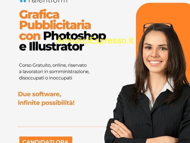 corso Grafica Pubblicitaria Photoshop e Illustrator (corso GRATUITO online, full time), 6 marzo TALENTFORM, Ente Formativo a carattere nazionale, realizza il corso di formazione professionale gratuito per Grafica Pubblicitaria con Photoshop e Illustrator rivolto a candidati a missione di lavoro in somministrazione (occupati e/o disoccupati), residenti e/o domiciliati in Emilia Romagna, Friuli Venezia Giulia, Lazio, Lombardia, Marche, Piemonte, Toscana, Trentino Alto Adige, Veneto, Abruzzo, Molise iscritti e selezionati dalla APL MAW. Il corso è finanziato dal Fondo Forma. Temp. e promosso dalla APL MAW in collaborazione con l?Ente Attuatore HOWAY S. r. l. Con questo corso di Grafica con Adobe Illustrator e Photoshop acquisirai tutti i segreti per creare immagini e grafiche di altissimo livello e che catturano l?attenzione. Imparerai a manipolare foto, creare loghi, progettare campagne pubblicitarie e molto altro ancora. https://www. talentform. it/formazione-professionale/grafica-pubblicitaria-con-photoshop-e-illustrator-corso-gratuito-online-full-time-id2733/ Roma (RM)