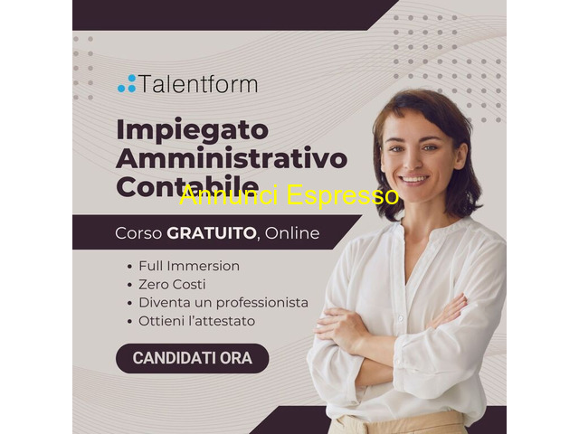 corso Impiegato Amministrativo Contabile (corso GRATUITO online, full time), edizione del 10 nov Corso online gratuito per impiegato amministrativo contabile. Full immersion, zero costi, diventa professionista. Il corso ha l?obiettivo di formare una risorsa in grado di saper svolgere all?interno di un?azienda tutte le mansioni relative ai principali processi amministrativo ? contabili. Verranno, altresì, fornite le competenze specialistiche teorico ? pratiche necessarie per la tenuta della contabilità ordinaria. Candidati ora. https://www. talentform. it/formazione-professionale/impiegato-amministrativo-contabile-corso-gratuito-online-full-time-id2501/?occurrence=[NUM] Roma (RM)