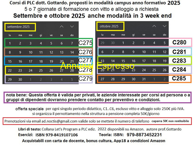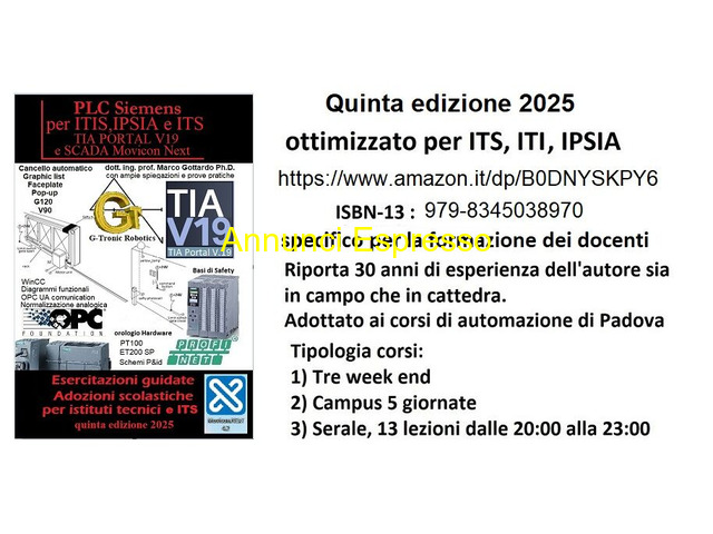 corso Siemens TIA PORTAL V21 - campus oppure serale oppure week end Corsi base, partire da 305?, o avanzati, della durata di 5 o 7 o 10 o 14 giorni. Possibilità di corsi in tre week end, oppure online per chi è impossibilitato a raggiungere la sede. E' possibile richiedere il vitto e alloggio. Libro "PLC Sistema per l'Automazione Industriale" quinta edizione 2025. Ottimizzato per ITS, ITI, IPSIA, adottato anche ai corsi di automazione a Padova. ISBN:[NUM] Ci sono sessioni tutto l'anno, anche durante le vacanze di natale e pasquali. Padova (PD)