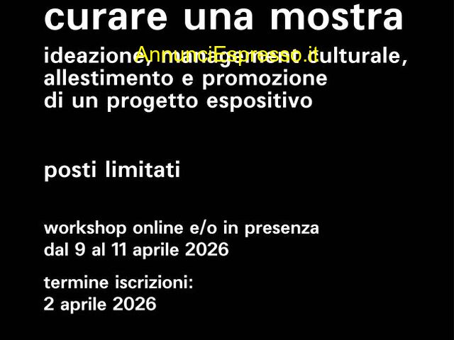 corso workshop curare una mostra - ideazione, management, allestimento e promozione durata Dal 9 al 11 aprile 2026 prezzo EUR.390,00 Workshop in presenza e online Seguire l?organizzazione di un padiglione alla Biennale di Venezia, così come gestire il personale in un museo, una galleria privata o uno spazio no profit ?. sono mansioni che richiedono la capacità di lavorare in modo indipendente e collaborativo per seguire i progetti dalla nascita e /o dalla proposta alla consegna finale. Gestire le diverse professionalità che gravitano attorno la costruzione di una mostra in un museo, o semplicemente per uno spazio indipendente, organizzare e amministrare progetti e contratti: queste che potrebbero sembrare semplici attività richiedono una conoscenza e una competenza pratica che il workshop intensivo che la School for Curatorial Studies Venice offre a tutti coloro che desiderano acquisire gli strumenti per poter gestire degli eventi dai grandi musei alle piccole gallerie. School for Curatorial Studies Venice San Marco 3073, Venice 30124 Tel: [NUM] E: W: www. corsocuratori. com Venezia (VE)