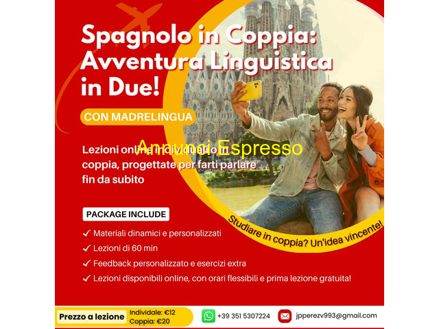 corso Spagnolo in Coppia: Avventura Linguistica in Due! Lezioni online per coppie di amici, familiari, partner o colleghi: un?esperienza condivisa che unisce, diverte e motiva! Ciao! Sono Jennifer Paola, insegnante madrelingua di spagnolo certificata da ELE International. Lezioni di spagnolo per viaggiatori o interesse personale: (per ogni livello e fascia d?età ) - Lezioni individuali - Lezioni dedicate alle coppie. - Il mio metodo si basa sulla comunicazione reale, con materiali dinamici e adattati a ogni studente. - Lezioni disponibili online, con orari flessibili Primo incontro gratuito. (Per definire insieme i tuoi obiettivi) Tariffe speciali: - Individuale: 12 ? - Coppie: 20 ? Scrivimi e iniziamo l?avventura linguistica insieme! Bari (BA)