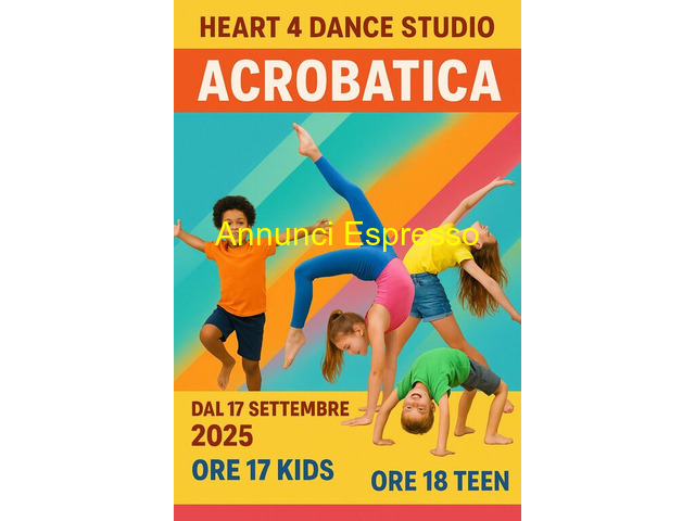corso Corso di ACROBATICA Kids & Teen ?? Vuoi metterti alla prova e imparare capovolte, ruote e tanto altro? divertendoti? Allora questo è IL CORSO PERFETTO per te! L?Acrobatica unisce movimento, gioco e tecnica, in un?attività entusiasmante che sviluppa: ? Coordinazione e agilità Forza, equilibrio e controllo del corpo Autostima, concentrazione e fiducia in se stessi Durante le lezioni, bambini e ragazzi saranno seguiti da istruttori qualificati in un ambiente sicuro e stimolante, dove ogni progresso viene valorizzato. ? Si lavora a corpo libero, su tappetoni e attrezzi morbidi. Per chi è pensato il corso? Per chi vuole muoversi divertendosi Per chi ama le sfide fisiche Per chi sogna di fare la ruota? e magari anche la verticale! Via Muro Lucano 2 ? Capannelle, Roma Prenota la tua prova gratuita! [NUM] ? www. heartfordance. com Dal 17 settembre: scopri quanto è bello superare i tuoi limiti? giocando! Roma (RM)