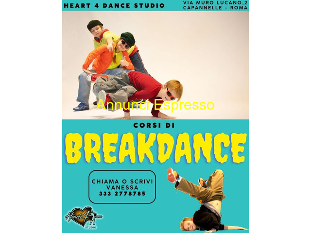 corso Corso di Breakdance BREAKDANCE Salti, giri, power move ed energia pura! Il corso di Breakdance è un mix esplosivo di movimento, ritmo e creatività. Qui si impara a usare il corpo in modo dinamico, potente e controllato, sviluppando forza, coordinazione, agilità e musicalità? divertendosi! Tra footwork, freeze e sequenze sempre nuove, ogni lezione diventa una sfida stimolante dove mettersi in gioco, superare i propri limiti e sentirsi parte di un gruppo carico di energia. Un corso ideale per chi ama muoversi, esprimersi e dare libero sfogo al proprio stile. Niente noia, solo movimento, musica e tanta adrenalina Heart 4 Dance Studio Via Muro Lucano 2 ? Capannelle (Roma) Info e iscrizioni: Vanessa [NUM] Roma (RM)