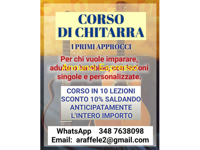 corso Corso di chitarra Corso di chitarra per principianti, lezioni personalizzate per adulti e bambini. CORSO IN 10 LEZIONI con sconto del 10% per pagamento anticipato. Contatti WhatsApp e email per maggiori informazioni. Disponibile a tutti. A Torino in zona Borgo San Paolo Torino (TO)
