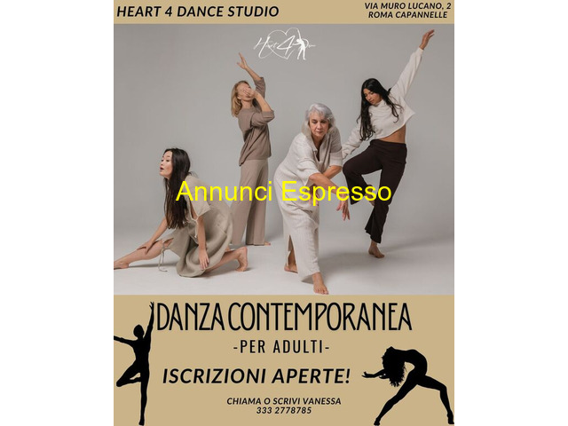 corso Corso di DANZA CONTEMPORANEA ADULTI Danza Contemporanea per Adulti ? Heart 4 Dance Studio Lascia che il corpo parli, respiri e si muova liberamente. La danza contemporanea è un viaggio dentro te stesso: un dialogo tra corpo, emozione e musica. Un corso pensato per adulti di ogni livello che vogliono: Riscoprire la gioia del movimento Esprimere emozioni e creatività Migliorare postura, forza e consapevolezza corporea Concedersi un momento solo per sé Ogni lezione è un?esperienza che unisce tecnica e libertà, in un?atmosfera accogliente e ispirante Heart 4 Dance Studio ? Via Muro Lucano 2, Roma Capannelle Info e iscrizioni: Vanessa [NUM] Lascia fluire la tua energia? e danza con noi! Roma (RM)