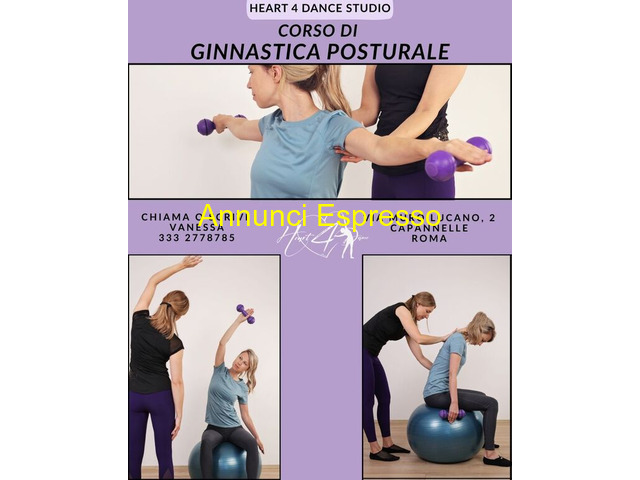 corso Corso di Ginnastica Posturale GINNASTICA POSTURALE Muoversi meglio? e sentirsi meglio! Se la schiena brontola, il collo è sempre in tensione o semplicemente senti il bisogno di rimettere il corpo ?in ordine?, questo corso fa per te. La ginnastica posturale ti aiuta a ritrovare equilibrio, mobilità e una postura più naturale, il tutto in un clima sereno, accogliente e senza stress. Le lezioni sono guidate con attenzione e gradualità, ideali per chi vuole prendersi cura di sé, sciogliere le rigidità e muoversi con più leggerezza nella vita di tutti i giorni. Niente competizione, niente fretta: solo movimento consapevole, ascolto e benessere. Un?ora tutta per te? il tuo corpo ti ringrazierà Heart 4 Dance Studio Via Muro Lucano 2 ? Capannelle (Roma) Info e iscrizioni: Vanessa [NUM] Roma (RM)