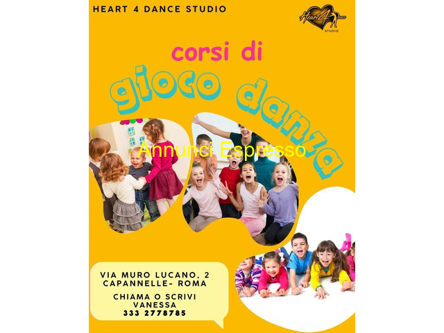 corso Corso di Gioco Danza GIOCO DANZA ? Il primo passo nel mondo magico della danza! Gioco Danza è il corso pensato per i più piccoli, dove fantasia, movimento e musica si incontrano per sviluppare: coordinazione creatività ascolto equilibrio socializzazione Attraverso giochi motori, piccole sequenze e attività ritmate, i bambini imparano a conoscere il proprio corpo e ad esprimersi in modo libero e spontaneo? divertendosi! Un ambiente sicuro, accogliente e positivo, dove ogni bimbo può sentirsi speciale e muovere i primi passi verso la danza con gioia e leggerezza. Heart4Dance Studio ? Via Muro Lucano, 2 (Capannelle ? Roma) Info e iscrizioni: Vanessa [NUM] Roma (RM)