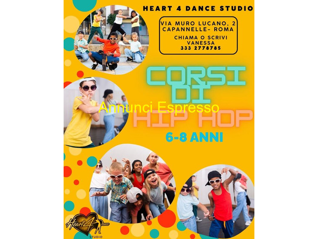 corso Corso di HIP HOP 6?8 ANNI HIP HOP 6?8 ANNI ? ENERGIA, MUSICA E DIVERTIMENTO! Un corso pensato per i piccoli ballerini che vogliono muoversi, esprimersi e liberare tutta la loro creatività! Attraverso giochi ritmici, passi base hip hop e mini coreografie super divertenti, i bambini imparano a: Coordinare il corpo e migliorare l?equilibrio Sviluppare musicalità e ritmo Allenare memoria, attenzione e sicurezza in sé Lavorare in gruppo divertendosi Esprimersi con personalità e stile! Un ambiente protetto, colorato e pieno di entusiasmo, dove ogni bambino viene valorizzato e accompagnato passo dopo passo. Heart4Dance Studio ? Via Muro Lucano 2, Capannelle (Roma) Info & iscrizioni: Vanessa [NUM] Roma (RM)