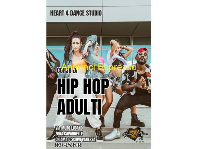 corso Corso di Hip Hop adulti HIP HOP ADULTI ? LIBERA L?ENERGIA CHE HAI DENTRO! Hai sempre sognato di ballare Hip Hop ma pensavi fosse ?troppo tardi?? È il momento di dimostrare il contrario! Il corso di Hip Hop per adulti di Heart4Dance Studio è pensato per chi vuole divertirsi, allenarsi e imparare coreografie super cariche, in un ambiente accogliente e motivante. Migliora coordinazione, ritmo e tonicità Libera lo stress e ritrova fiducia in te stesso Allenati con musica, stile e tanta energia positiva Non serve esperienza: solo voglia di muoverti, sorridere e dare il massimo! Heart4Dance Studio Via Muro Lucano, 2 ? Capannelle, Roma Chiama o scrivi Vanessa: [NUM] Roma (RM)