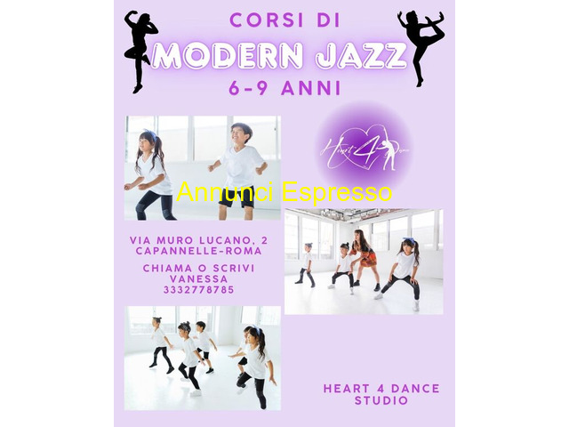 corso Corso di MODERN 6-9 anni CORSO DI MODERN JAZZ 6?9 ANNI Movimento, energia e divertimento a ritmo di musica! Nel corso di Modern Jazz Kids, i bambini imparano a conoscere il proprio corpo, migliorano la coordinazione e scoprono la magia della danza moderna attraverso il gioco e la creatività Ogni lezione è una piccola esplosione di energia positiva, con musica coinvolgente e coreografie che fanno sognare Crescita, ritmo e tanta allegria: questo è il Modern Jazz di Heart4Dance Studio! Heart4Dance Studio ? Via Muro Lucano 2, Capannelle ? Roma Info e iscrizioni: Vanessa [NUM] ? Lezione di prova gratuita! Roma (RM)
