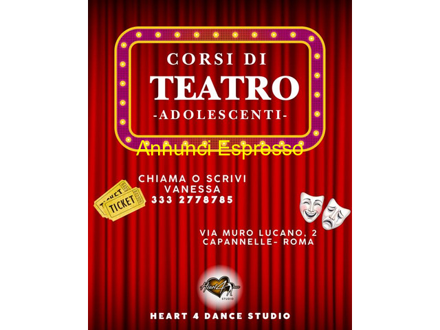corso Corso di TEATRO TEEN TEATRO ADOLESCENTI ? LIBERA LA TUA VOCE, IL TUO CORPO, LA TUA PERSONALITÀ! Un percorso pensato per ragazzi e ragazze che vogliono mettersi in gioco, conoscere se stessi e sviluppare un vero carisma scenico. Nel nostro corso i giovani attori lavoreranno su: Espressività corporea e vocale Immaginazione, creatività e improvvisazione Presenza scenica e sicurezza personale Lavoro di gruppo e ascolto Preparazione di scene, personaggi e piccole performance Un ambiente protetto, stimolante e divertente dove ogni adolescente può crescere, trovare la propria forza e scoprire talenti nascosti. Heart4Dance Studio ? Via Muro Lucano 2, Roma Info & iscrizioni: Vanessa [NUM] Iscrizioni aperte! Prenota la tua lezione di prova e inizia il tuo viaggio sul palcoscenico. Roma (RM)