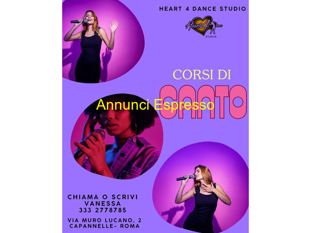 corso Lezioni di CANTO LEZIONI DI CANTO ? Trova la tua voce, libera la tua emozione! Il canto non è solo tecnica? è espressione, libertà e passione! Attraverso un percorso personalizzato, imparerai a conoscere e potenziare la tua voce, migliorando respirazione, intonazione, interpretazione e presenza scenica. Che tu sia principiante o già esperto, il nostro corso ti aiuterà a tirare fuori la tua vera voce e a cantare con sicurezza, emozione e consapevolezza Lezioni individuali e di gruppo Adatto a tutte le età e livelli Con approccio moderno e coinvolgente Heart4Dance Studio ? Via Muro Lucano, 2 (Capannelle ? Roma) Info e iscrizioni: Vanessa [NUM] Roma (RM)