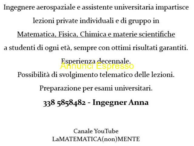 aiuto per lezioni di analisi fisica Ingegnere aerospaziale con esperienza decennale impartisce lezioni individuali e di gruppo in Matematica, Fisica, Chimica e materie scientifiche. Preparazione per esami universitari ed esami di stato. Napoli (NA)