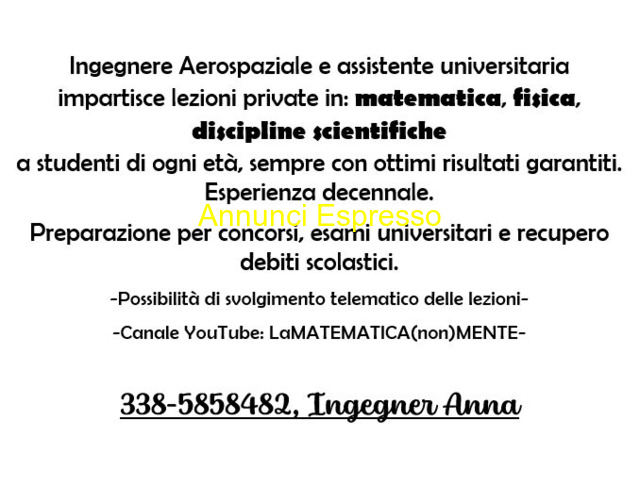 aiuto per lezioni di fisica Si impartiscono lezioni private di matematica, fisica e discipline scientifiche da parte di ingegnere aerospaziale e assistente universitaria. Preparazione per esami e debiti scolastici. Possibilit� di lezioni online. Esperienza decennale. Napoli (NA)