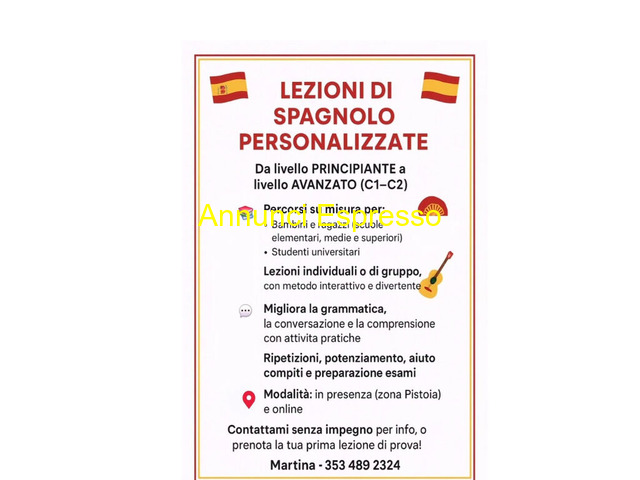 aiuto per lezioni di SPAGNOLO Lezioni di spagnolo personalizzate per principianti e avanzati C1-C2. Miglioramento grammaticale e pratico, recupero scolastico. Disponibile online e in presenza. Prezzo da concordare. Contatti per informazioni. Pistoia (PT)