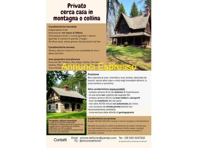 Cerco casale 200mq Discreto su più livelli numero locali > cinque numero bagni tre Privato prezzo EUR.200.000,00 anno 1950 Classe energetica In attesa di certificazione IPE nn nn Cerco casa da acquistare per realizzare un luogo di formazione residenziale aperto a persone e gruppi. Caratteristiche: – Indipendente 4 lati – Dimensione non meno di 200mq – Struttura sana, senza necessità di grosse ristrutturazioni – Ben esposta al sole, orientata a sud, isolata, attorniata da boschi, senza altre case a vista nei dintorni, in zona turistica o prossima. Altre caratteristiche: – lontano almeno 8 km da antenne di trasmissione (telefoniche o altro) – in una zona non coperta dal segnale 5G – lontano almeno 50 km da basi militari – lontano almeno 50 km da aeroporti – fuori da traiettorie dei voli aerei – non oltre 40-50 minuti dall’autostrada più vicina – con accesso da strada privata (anche non necessariamente asfaltata) – zona esclusa dalle attività di geoingegneria L’area geografica di preferenza: zona est del Trentino, Alto Adige, Carnia, Toscana, Umbria, Piemonte (preferibilmente zona nord o cuneese), Appennino Tosco-Emiliano. Budget: 100. 000-200. 000 Trento (TN)