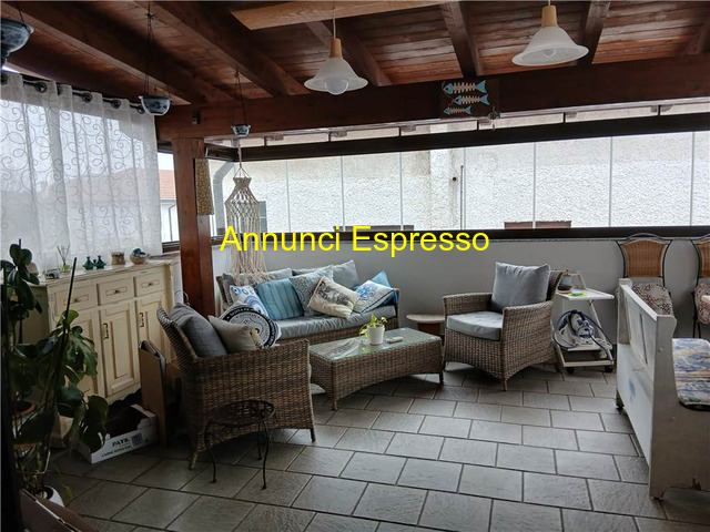 al primo piano c?€?è una cucina abitabile e un secondo bagno con doccia oltre a uno splendido terrazzo di 30 mq, coperto e completamente vetrato, con travi di legno a vista, vivibile tutto l?€?anno perché corredato da riscaldamento