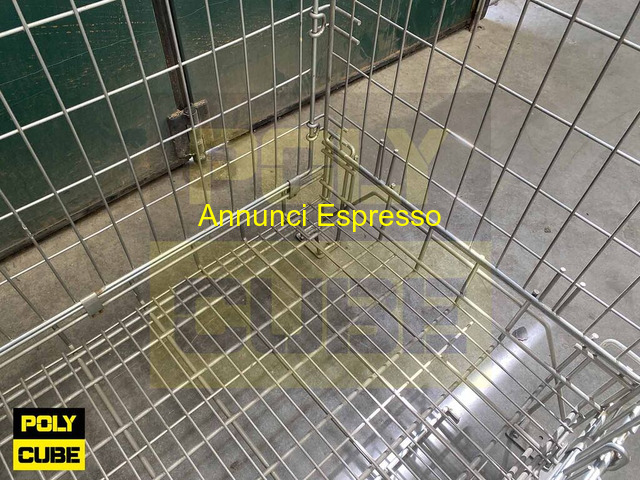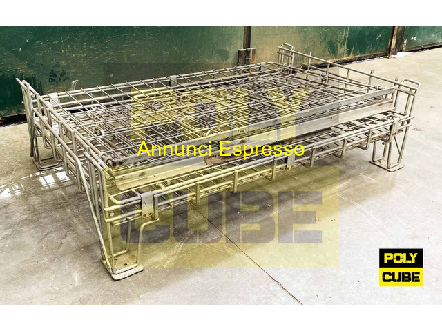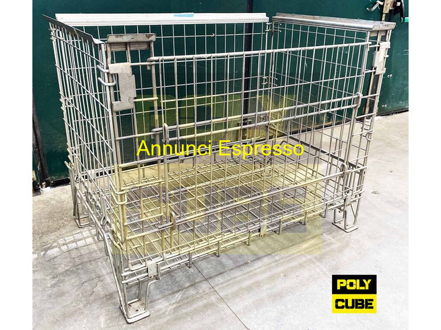 Ceste in filo metallico zincate usate prezzo EUR.1.111,00 Contenitori in rete o ceste formato cm 120x80 in filo metallico zincato. Sono richiudibili per ottimizzare la logistica di ritorno e lo spazio magazzino, sono accatastabili tra di loro sia da aperti che da chiusi, sono compatibili all?impilamento con pedane Epal 120x80 ed hanno la particolare doppia apertura dell?anta sul lato lungo che raddoppia la superficie di apertura laterale. Lotto di OTTIMA QUALITA? come da documentazione fotografica. Misure max ingombro: cm 120x80 H97 Misure da chiusi: cm 120 X 80 H33. 5 Misure interne: cm 117 X 77 H80 Proposti da Polycube Srl. PREZZO SU RICHIESTA, riferimento MC020-11, possibilit? di spedizione, disponibilit? SALVO IL VENDUTO. Cassa di metallo resistente, utilizzata per stoccaggio o trasporto. Struttura a rete, facile da assemblare e disassemblare. Dimensioni compatte. Poppi (AR)