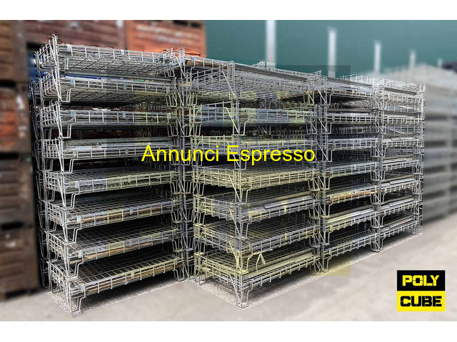 Gabbie o ceste metalliche sovrapponibili prezzo EUR.1.111,00 Contenitori o ceste formato cm 120x80 in filo metallico zincato. Sono richiudibili per ottimizzare la logistica di ritorno e lo spazio magazzino, sono accatastabili tra di loro sia da apert...