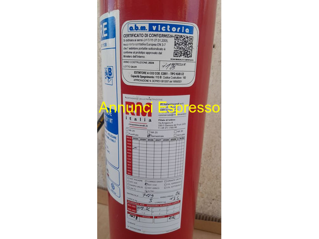 Estintore portatile anidride carbonica CO2 5kg. prezzo EUR.65,00 Estintore portatile anidride carbonica CO2 da carica interna 5 kg. Della A. B. M. Victoria Da appoggiare a terra o al muro affidabile per la protezione contro incendi di classe B, tipici di liquidi infiammabili e gas. sicuro su apparecchiature elettriche. Peso 13, 6 kg. Dimensioni 14 x 74 cm. Comprato nel Settembre 2024 scade il 09 / 2034 revisione nel 09 / 2029 mai utilizzato come nuovo Ritiro su Grosseto o spedizione. Estintore rosso, valido per incendi di classe A-B-C, manico e tubo flessibile inclusi, in buone condizioni. Grosseto (GR)
