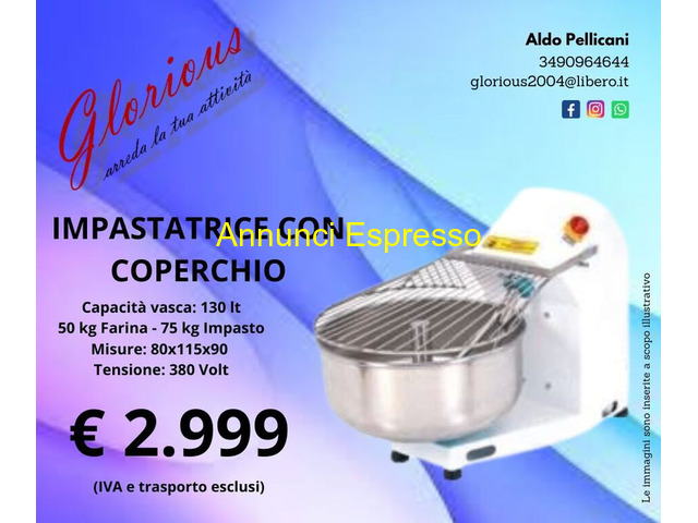 Impastatrice con coperchio prezzo EUR.2.999,00 Impastatrice con coperchio, capacit? vasca: 130 lt. 50 kg. di farina-75 kg. impasto, misure: 80 x 115 x 90, 380 Volt, ? 2. 999 Iva e trasporto esclusi, per info: Ruvo di Puglia (BA)
