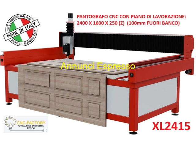 Pantografo CNC 2400x1500x250 Falegnamerie e marmi prezzo EUR.17.325,00 Macchina CNC per lavorazione 2D e 3D di legno, materie plastiche e marmo. Volume di lavoro 2400x[NUM] fuori banco)x250mm. Macchina made in Italy, software e hardware controllo cnc italiano, servomotori Estun. Precisione 0, 1/1000mm, velocità 10m/min. Brescia (BS)