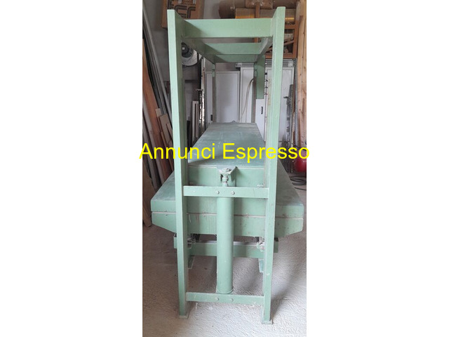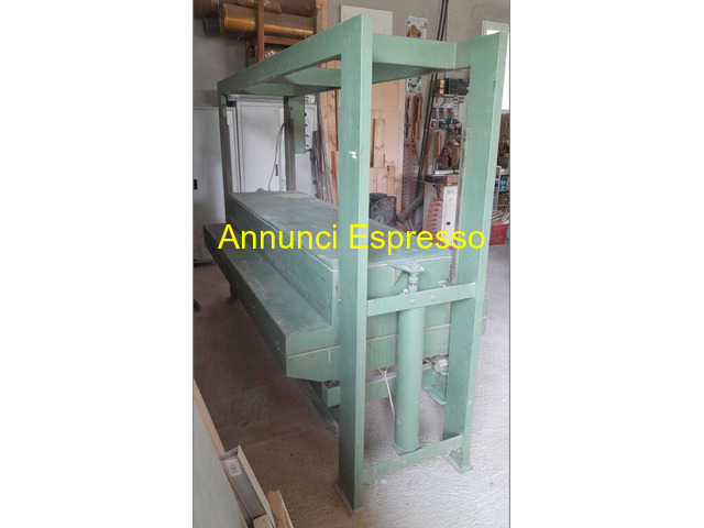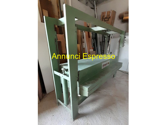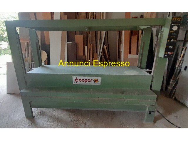 Pressa ad aria compressa Modello FT72 prezzo EUR.1.400,00 Pressa ad aria compressa Modello FT72 Cooper . misure piano pressatura larghezza 100 x lunghezza 220 cm misure ingombro macchina largh 100 x lung 260 x alte 185 cm. funzionamento con 2 pistoni per sollevamento e chiusura, blocco piano e attivazione compressione, manometro aria, lavora da 0 atmosfere e arriva a 10 perfetta senza difetti ho anche video del suo funzionamento ritiro zona Grosseto a carico di chi acquista . Macchina per la lavorazione del legno, struttura in metallo, usata, in buone condizioni. Adatta per falegnameria e carpenteria. Grosseto (GR)