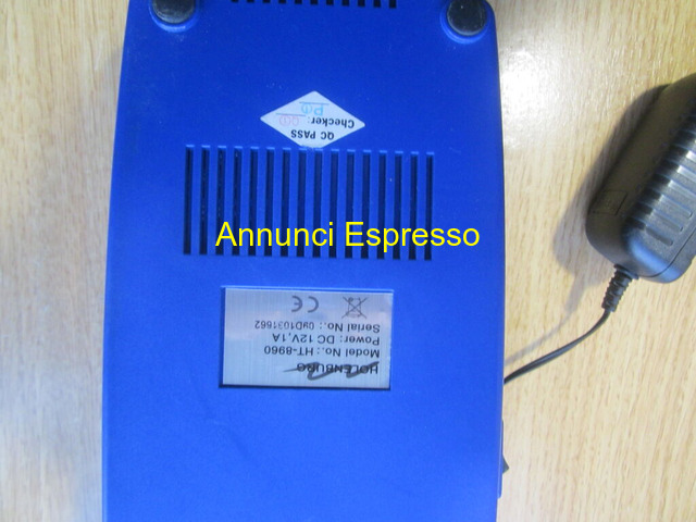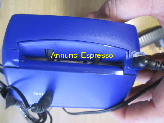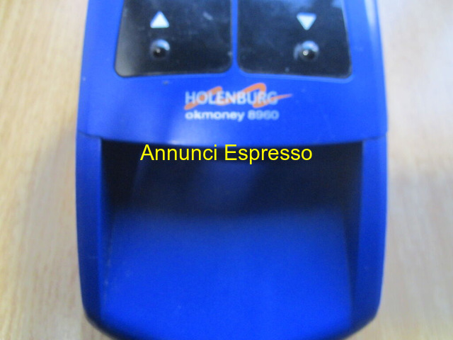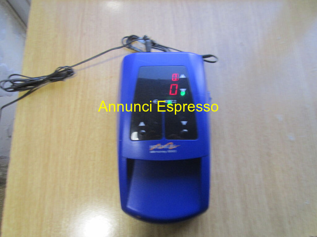 RILEVATORE CONTA SOLDI EURO ( FALSI) OK MONEY prezzo EUR.40,00 Rilevatore-Professionale-d-Banconote-Euro-eFranco-Svizzero. -Inserimento delle banconote in qualsiasi verso. - Controlli-effettuati:-magnetico-filigrana-infrarossi?dimensioni-inchiostri-Il display indica il valore ed il totale delle banconote?Verificate-Allarme visivo e sonoro in presenza di banconote ritenute contraffatte: le banconote sospette vengono rifiutate. dall?apparecchio. -BATTERIE-ricaricabili-Dimensioni:cm. 22, 1x12x9, 8Peso:Kg1, 2Alimentazione: AC200V 50HZ Consumo: Dispositivo elettronico portatile blu con display digitale e cavi, funzionalit? non specificata. Mondragone (CE)