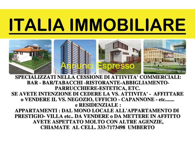 TABACCHI BAR NUOVA VIGEVANESE prezzo EUR.440.000,00 BAR TABACCHI ZONA NUOVA VIGEVANESE CEDESI ATTIVITA' LOCALE DI 2 VETRINE STRADA DI FORTE VISIBILITA' ALL'INTERNO DEL LOCALE E' PRESENTE UNA PICCOLA MA ATTREZZATA CUCINA CON CANNA FUMARIA. AGGI 110, 000 ANNUI - BAR CASSETTO 750 EURO GG INCREMENTABILI. GLI ATTUALI CONDUTTORI PERCHE ANZIANI APRONO ALLE 08, 00 E CHIUDONO ALLE 18, 00 DOMENICA CHIUSI RICHIESTA DI CESSIONE 440. 000 EURO Per Maggiori informazioni contattate: AGENZIA ITALIA IMMOBILIARE tel. UMBERTO Ps. Immagini e Prezzi e misure indicati sono fornite a solo scopo illustrativo, non sempre reali e non costituiscono elemento contrattuale. Milano (MI)