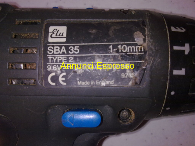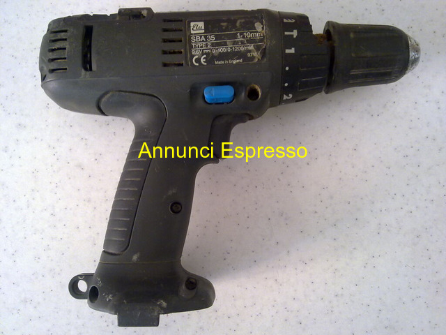 Trapano Avvitatore ELU SBA 35 solo corpo macchina prezzo EUR.20,00 Trapano Avvitatore ELU SBA 35 a batteria solo corpo macchina con percussione per forare muri , 2 velocit?: a 1 lenta e molto potente 0-400/giri, a 2 veloce e forte, 0-1200, mandrino auto-serrante per punte misura 1 a 10 mm. batteria da 9, 6 volt (non fornita) . funzionante basta mettere batteria, . Ghiera frizione rotta ma funzionante, Ottimo anche per pezzi di ricambio ritiro su Grosseto o spedizione. Grosseto (GR)