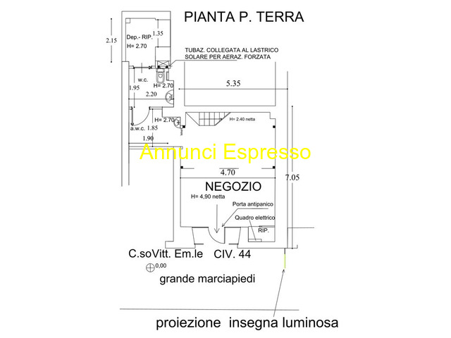 in affitto ufficio vic municipio ospeda 60mq affitto Euro 400 per mese Privato IPE 50 Classe energetica A Triggiano c. so Vittorio Emanuele, 44 affittasi a referenziati luminoso centralissimo locale uso negozio, ufficio  o simili attività di mq 36, 00 , oltre mq. 16, 00 w. c. -a. w. c. e rip. -deposito oltre soppalco di mq. 14. 50. TOTALE MQ. 66, 50 . impianti tecnologici autonomi: climatizzatore, imp. elettrico, TV, allarme e idrico fognario --affitto mensile: ? 400, 00 E? possibile anche la vendita di insegna esterna luminosa e di parte arredo-attrezzatura del negozio attuale Ben collegato a mezzi pubblici e alla nuova circonvallazione di Triggiano : TEL. -- [NUM] Pianta di un negozio al piano terra, area commerciale con metrature specifiche e proiezione insegna luminosa, posizione su via principale. Triggiano (BA)