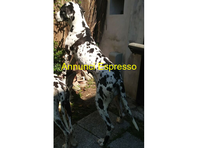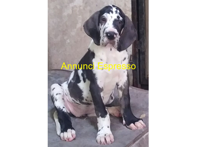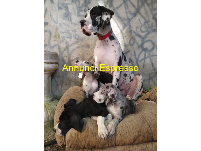 Alani prezzo EUR.1.300,00 cucciolo di alano arlecchini e neri, taglia grande. Et? 60 giorni, Con tutti i documenti di legge e pedigree. Sverminati e vaccinati. Ottimi compagni e guardia. adorabili e affettuosi. Genitori visibili. disponibili per adozione. Tel [NUM] Chieve (CR)