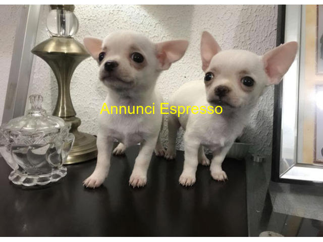 Chihuahua toy maschietti prezzo EUR.699,00 Chihuahua Toy maschietti di 2 mesi compiuti sono in pronta consegna. Sono di colore bianco. Li cediamo regolarmente vaccinati e con doppio vermifugo. Sono iscritti all'anagrafe canina con chip inserito e passaggio proprietà incluso. Si rilascerà libretto veterinario. Mamma e papà appartengono a noi e sono entrambi Toy. PREZZO EURO 700, 00 Se interessati chiamare il [NUM] no messaggi. Milano (MI)