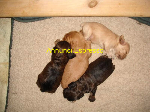 Cocker Spaniel cuccioli prezzo EUR.800,00 Allevamento 100% italiano con genitori dei cuccioli visibili accetta prenotazioni per bellissimi cuccioli di Cocker Spaniel di colore fulvo rossiccio e nero. La consegna è prevista verso la prima settimana quando avranno compiuto 2 mesi. Al momento del ritiro avranno eseguito primo vaccino e le sverminature di routine. Saranno microchippati e iscritti all'anagrafe canina e con passaggio di proprietà incluso. Si rilascerà garanzia sanitaria scritta con validità di 1 anno insieme al libretto sanitario. Verrà eseguito anche il trattamento Frontline. Prezzo Euro 800, 00. Prezzo euro 750. 00 neri Diamo e chiediamo massima serietà e competenza. Per maggiori informazioni chiamare il cellulare [NUM], no messaggi. Torino (TO)