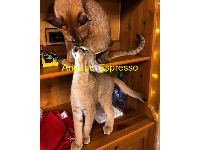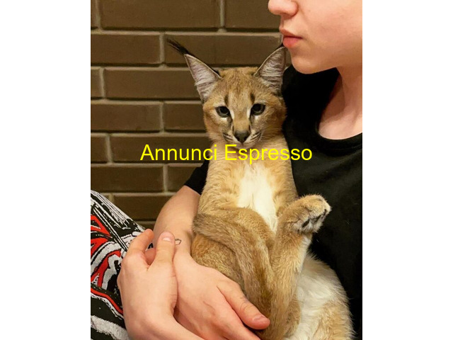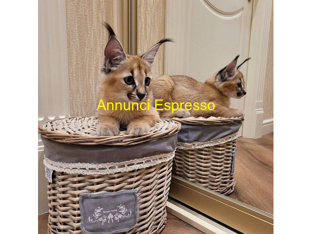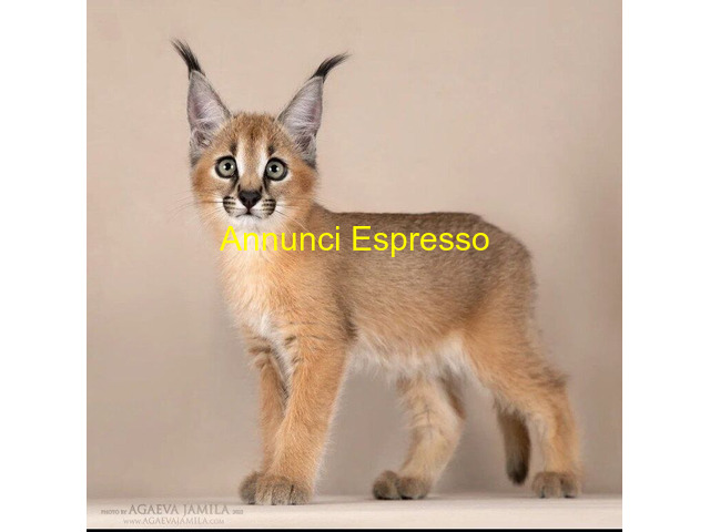 gattino caracal disponibile prezzo EUR.1.500,00 Sono nati due bellissimi gattini di caracal: due maschi e due femmine. Saranno sverminati e dotati di certificato sanitario, passaporto europeo, permesso CITES e certificato veterinario. I gatti vivono in casa, circondati da animali e bambini. Sono quindi molto socievoli, coccolosi, giocosi, adorabili e ben educati. I gattini non sono sterilizzati. Entrambi i genitori vivono in casa. Il pagamento rateale è possibile a determinate condizioni (contratto di vendita). La vendita è aperta a tutti. I curiosi e i frivoli sono pregati di astenersi. WhatsApp, Viber, Telegram. Cordiali saluti. Bastiglia (MO)