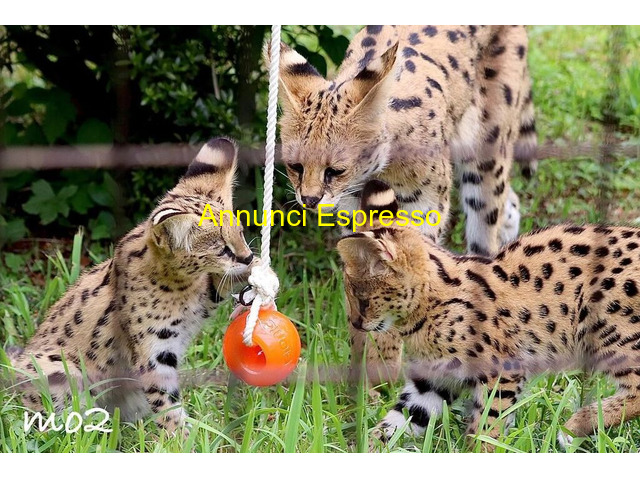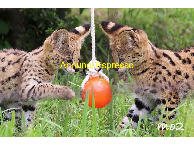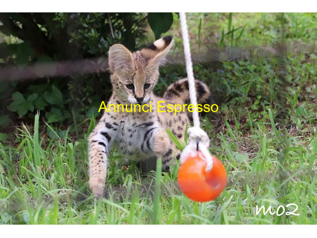 gattino serval disponibile prezzo EUR.1.500,00 Sono nati due bellissimi gattini di serval: due maschi e due femmine. Saranno sverminati, dotati di certificato sanitario, passaporto europeo, permesso CITES e certificati veterinari. Abituati a vivere in casa con bambini e altri animali, sono molto socievoli, affettuosi, giocherelloni, adorabili e ben educati. I gattini non sono sterilizzati/castrati. Entrambi i genitori vivono in casa. È possibile il pagamento rateale a determinate condizioni (contratto di vendita). Aperto a tutti. Solo per richieste serie. WhatsApp, Viber, Telegram. Cordiali saluti. Bastiglia (MO)