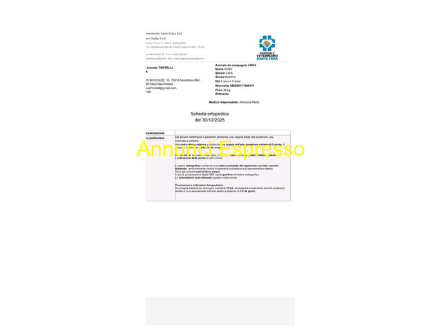 in regalo Meticcio Ciao a tutti, sono Koby, un meticcio di 5 anni salvato dalla strada a Bari. Non cerco una nuova famiglia perché ne ho già una che mi ama alla follia, ma purtroppo la mia umana Francesca da sola non riesce a pagarmi le due operazioni urgenti alle zampe (ho rotto entrambi i crociati!). Sto cercando ?Madrine e Padrini a distanza? che vogliano aiutarmi con una piccola donazione per l?intervento. Abbiamo aperto una raccolta trasparente con tutti i preventivi medici visibili. Se vuoi essere il mio zio virtuale e aiutarmi a camminare di nuovo, scrivici o visita il link qui sotto. Link GoFundMe: https://gofund. me/db240c3d4 Noicattaro (BA)