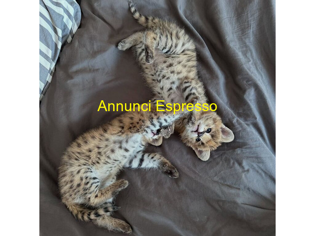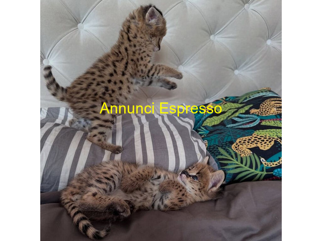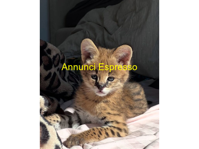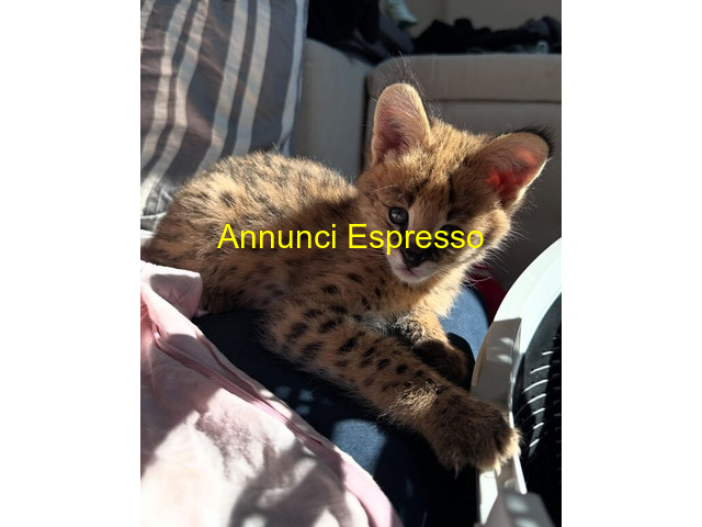 Serval eccezionale: l'eleganza prezzo EUR.1.500,00 I nostri due adorabili gattini sono ora pronti a raggiungere le loro amate case per sempre. Allevati a mano con tanto amore e pazienza, sono abituati alla presenza umana e ai rumori quotidiani. Molto giocosi, curiosi e affettuosi, sono dotati di microchip, vaccinati, sverminati e monitorati da un veterinario specializzato. Sono forniti di documenti CITES e certificato di trasferimento. Il loro mantello maculato dorato, lo sguardo penetrante e l'andatura felina rendono il serval un compagno eccezionale: un perfetto connubio tra la grazia di un gatto selvatico e la gentilezza di un felino di razza. Ci impegniamo a fornire un ambiente adatto, spazioso e sicuro per il loro benessere. Puoi contattarci tramite WhatsApp, Viber o Telegram. Campi Bisenzio (FI)