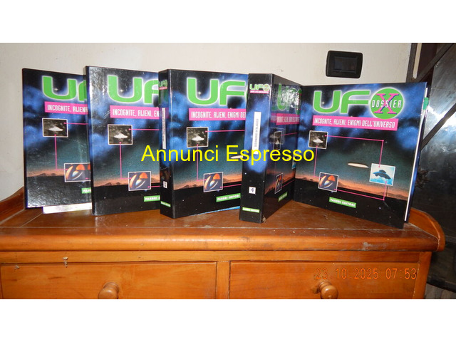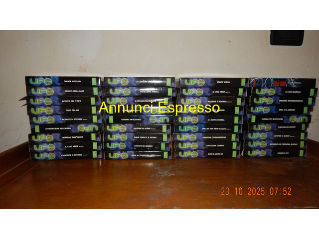 38 cassette VHS e 4 fascisoli con dispense UFO prezzo EUR.25,00 agli appassionati del mistero questa collezione di 38 cassette VHS e 4 facsicoli con dispense che ci accompagnano nell'enigma degli UFO. Sono veramente fra noi? Argenta (FE)