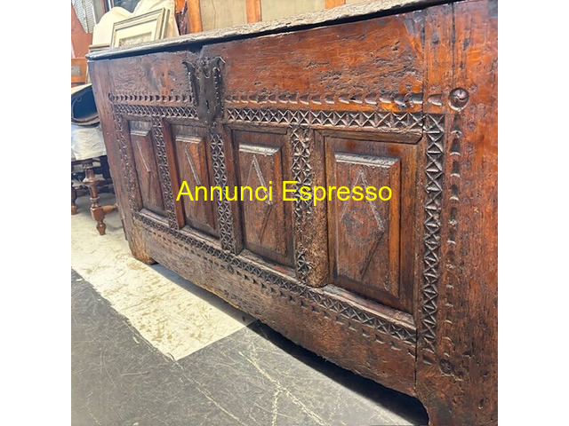 Antica cassapanca cassone XVII sec quercia . prezzo EUR.1.050,00 Antica splendida cassapanca cassone XVII secolo quercia . Tutta intagliata Intagliato. Fascino del tempo in patina , Mis 166 x 58 h 78 Buono stato di conservazione . Viterbo (VT)
