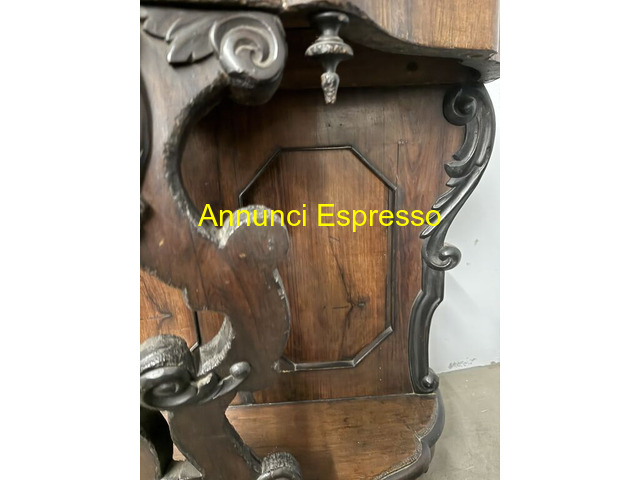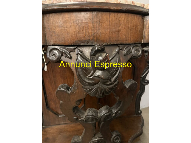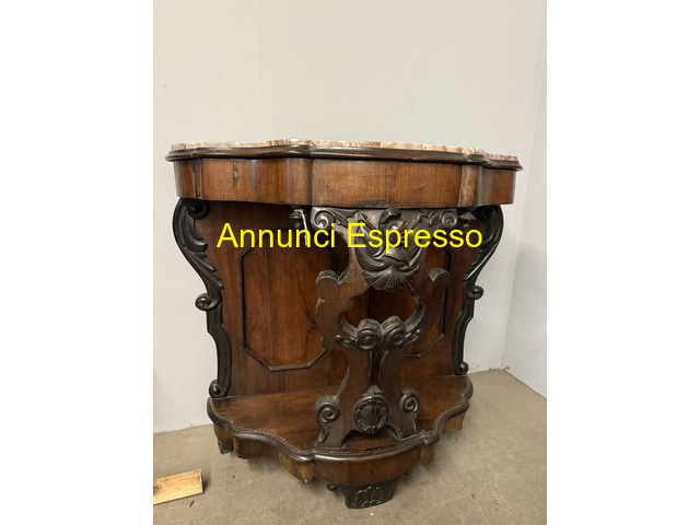 Antica console noce L.Filippo, '800, Napoli prezzo EUR.320,00 Antica console in noce Luigi Filippo, metà '800, Napoli, 100x103x43cm. Piano in marmo, intagliata frontale con bellissimi intagli. Mobile non restaurato. Viterbo (VT)