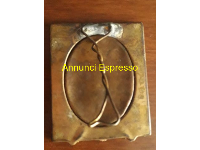 Antica piccola cornice portafoto in micromosaico , prezzo EUR.138,00 Antica piccola cornice portafoto in micromosaico , con fotografia soldato della prima guerra mondiale . Decoro di fiorellini bianchi e alpini posti su fondo di piccoli cerchi bronzati . Epoca inizi del XX? secolo, buono stato senza mancanze, piombatura del supporto sul retro come da foto , dimensioni cm . 5 x cm . 6 . Vendo ? 138. Gradito contatto telefonico . Lodi (LO)