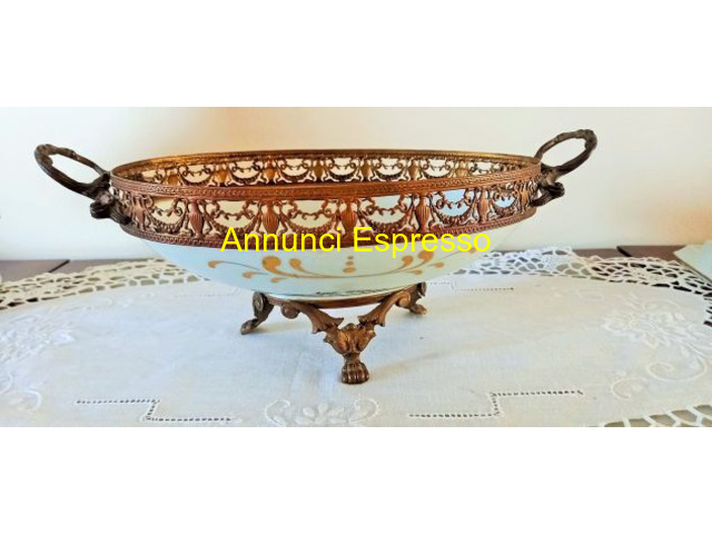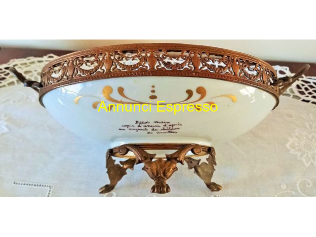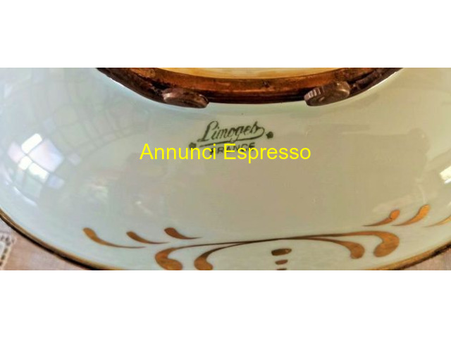 Antico Centrotavola Limoges . Ovale prezzo EUR.98,00 Antico Centrotavola Limoges prima metà '900. Ovale decorato dipinto a mano con inserti in oro. I manici , i piedini di supporto , rifiniture in tutto il perimetro sono in metallo dorato cesellato. Alla base porta la scritta ? Decor a main copie d'ancien d'apres un original du chateau de Versailles?. Perfetto lo stato di conservazione. Dimensioni cm 22 x cm 14, 5 altezza cm . 11 . Vendo ? 98 . Gradito contatto telefonico wapp. Cell [NUM]. Lodi (LO)