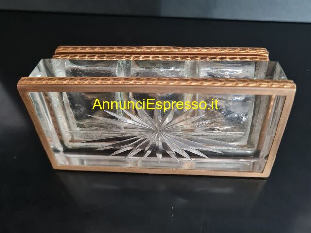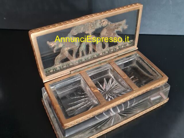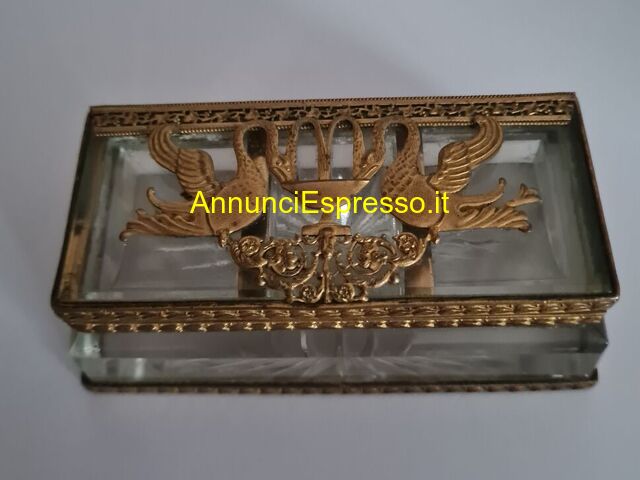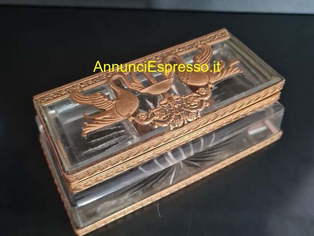 Antico cofanetto da scrivania stile Impero p prezzo EUR.238,00 Antico cofanetto da scrivania stile Impero porta timbri / francobolli, realizzato in cristallo molato con inserti in bronzo dorato . La base con n° 3 scomparti . Dimensioni cm . 10, 5 x cm . 5, 5 x cm . 3, 7. In ottimo stato come da foto. Vendo a ? 238. Gradito contatto telefonico wapp . [NUM] Lodi (LO)