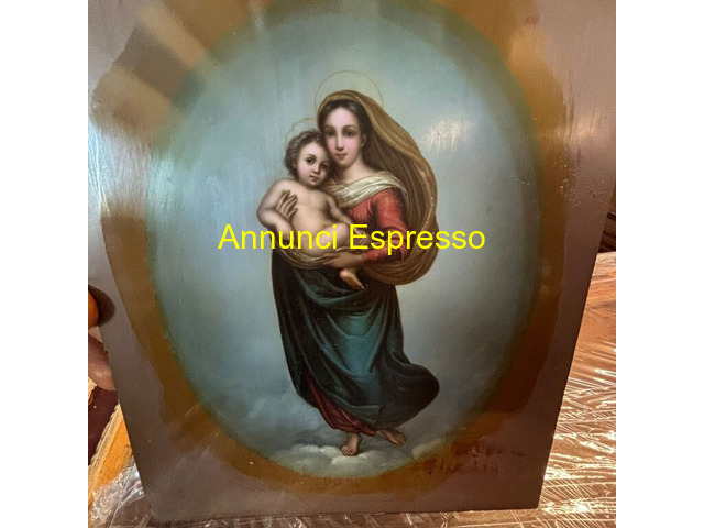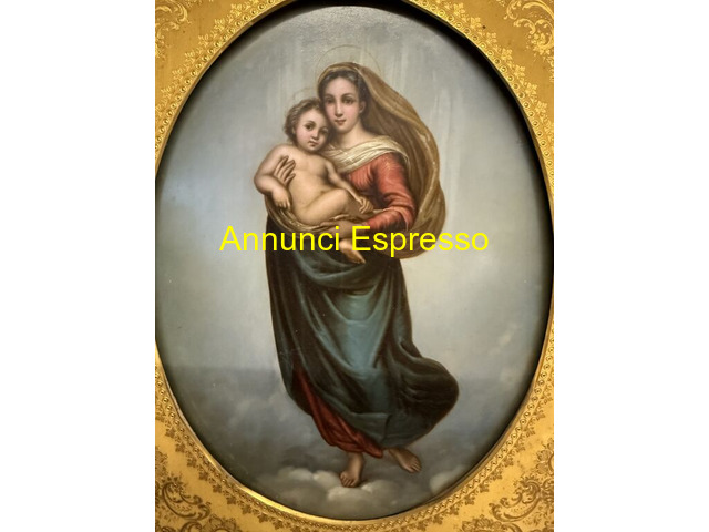 Antico olio su rame '800 Madonna di San Sisto prezzo EUR.270,00 Antico olio su rame epoca fine'800 Madonna di San Sisto mis 27x22cm, compresa la cornice antica intagliata, mis 30x34cm. Viterbo (VT)